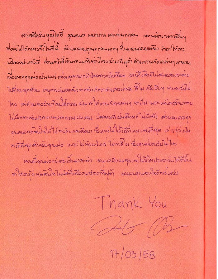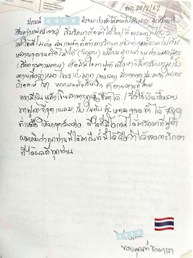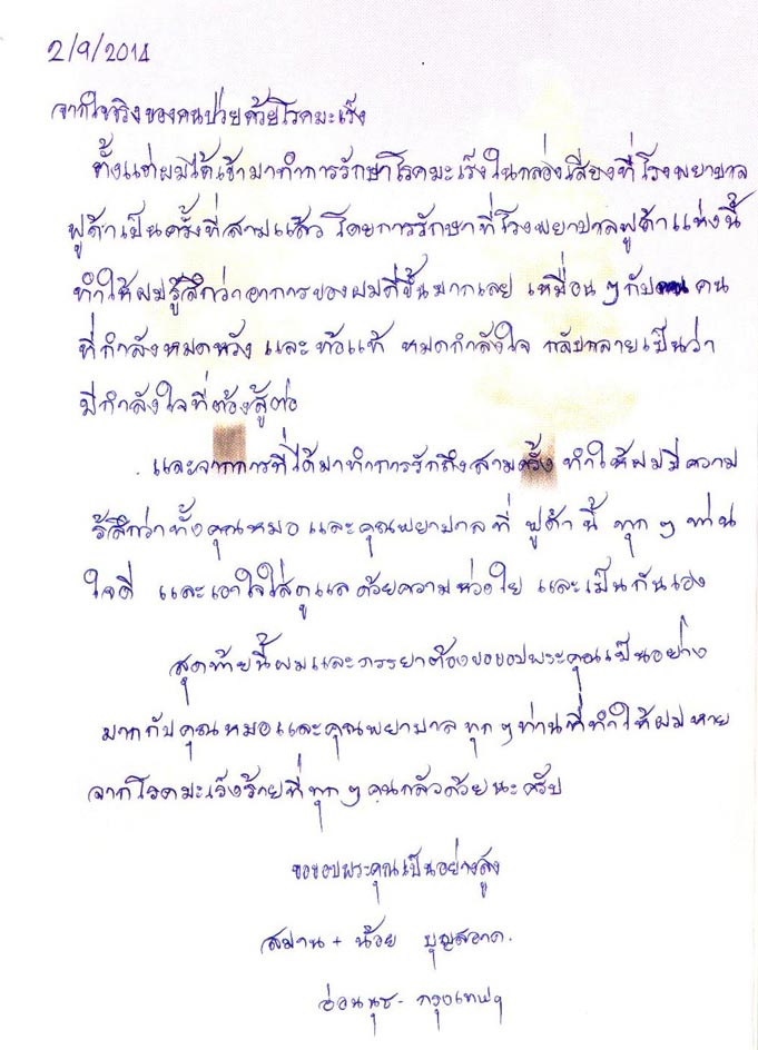 ในปี 2013 คุณสุวัฒน์ผู้ป่วยชาวไทยวัย 76 ปีมีอาการไอและเสมหะมีเลือดปน ออกมา หลังจากตรวจที่โรงพยาบาลเขา พบว่าตนเป็นมะเร็งปอด คุณหมอที่ โรงพยาบาลแนะนำให้เขาทำการผ่าตัดโดยต้องตัดปอดออกจำนวน 2 ใน 3 ของปอด “คุณพ่ออายุก็เยอะมากแล้ว จะสามารถรับการผ่าตัดไหวได้อย่างไร เราพี่น้องเลยตัดสินใจ ที่จะไม่ให้ท่านเข้ารับการผ่าตัด” ลูกสาวของคุณสุวัฒน์กล่าวด้วยความกังวลใจ
