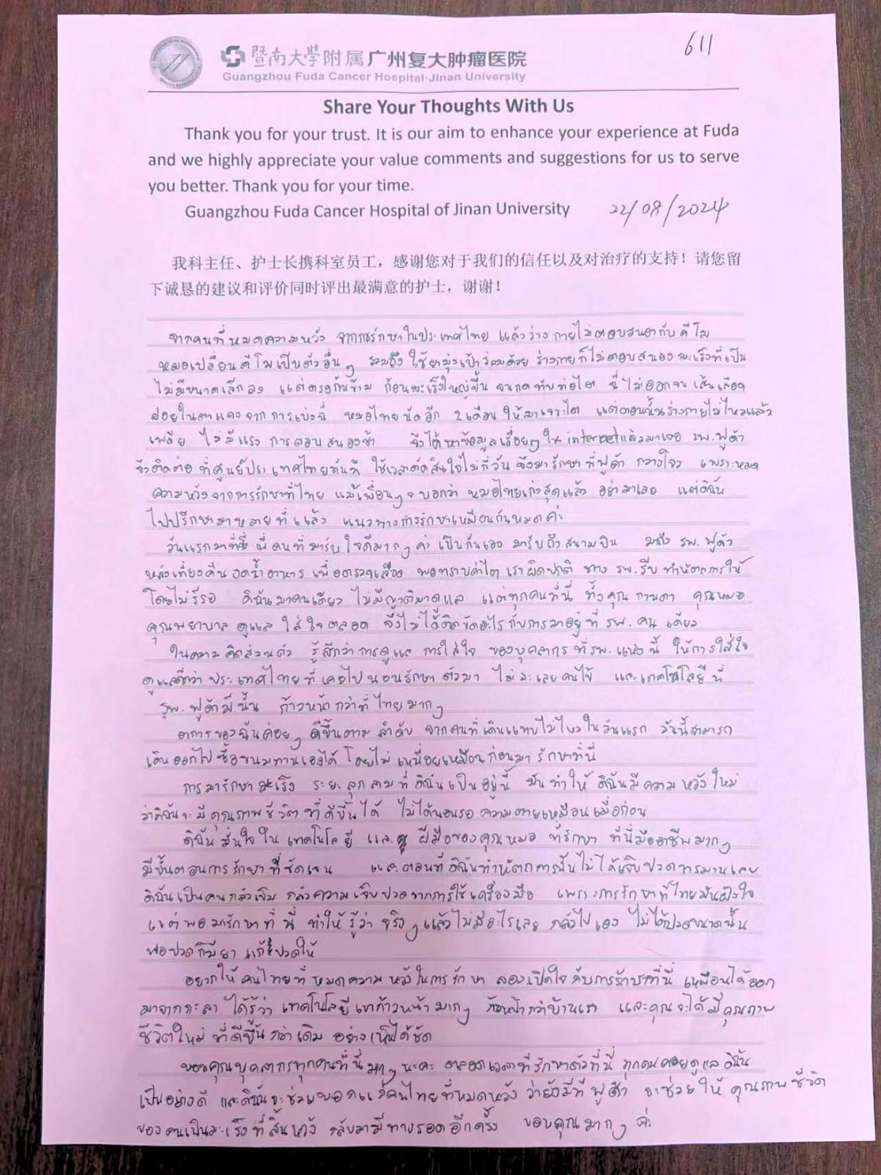 ครอบครัวของคุณสุวัฒน์ได้เดินทางไปปรึกษากับโรงพยาบาลต่างๆจนทั่ว สุดท้าย ญาติที่ซัวเถา ประเทศจีนได้มอบความหวังให้กับพวกเขา โดยแนะนำว่าที่โรงพยาบาล มะเร็งฟูด้ามีการรักษาที่ทันสมัย และในตอนนั้นมีแพทย์จากโรงพยาบาลมะเร็งฟูด้า ได้เดินทางไปสัมมนาที่ประเทศไทยเรื่องการรักษาด้วยความเย็นลูกสาวของคุณสุวัฒน์ได้เดินทางไปฟังสัมมนาและคิดว่าการรักษาด้วยความเย็นนั้นอาจจะสามารถช่วยเหลือคุณพ่อของเธอได้ เนื่องจากการรักษาดังกล่าวเป็นการรักษาแบบบาดแผลเล็ก มีผลข้างเคียงกับคนไข้น้อย เหมาะสำหรับผู้ป่วยอายุมากที่เข้ารับการผ่าตัดไม่ได้ลูกสาว ของคุณสุวัฒน์จึงตัดสินใจพาคุณพ่อของเธอมาเข้ารับการรักษาที่โรงพยาบาลมะเร็งฟูด้า หลังจากเข้ารับการรักษาทางแพทย์ได้ทำการตรวจร่างกายและวิเคราะห์อาการของคนไข้อย่างละเอียด ในเดือนตุลาคมปี 2013 คุณสุวัฒน์ได้เข้ารับการรักษาด้วยความเย็น พร้อมกับนำชิ้นเนื้อไปตรวจ การรักษาผ่านไปได้ด้วยดี และได้ผลเป็นที่น่าพอใจ จนถึงเดือนตุลาคมปี 2018 คุณสุวัฒน์ได้กลับมาตรวจติดตามอาการอีกครั้งและพบว่า ร่างกายของเขาปกติดี จากวันแรกจนถึงปัจจุบันเขารอดชีวิตมาได้กว่า 6 ปีแล้ว คลิกเพื่ออ่านเรื่องราวของคุณสุวัฒน์เพิ่มเติม